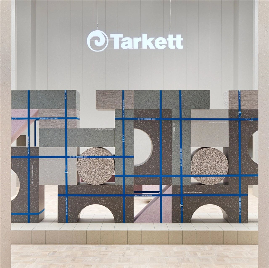 NoteDesign Studio在斯德哥爾摩設計周上為地板制造商Tarkett創建了一個展臺,展覽會結束時將其拆散并重新使用。該裝置探討了如何將可持續應用于展覽設計,其特征是通過帶子將堆疊的幾何形狀固定在一起。