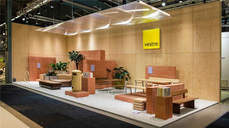 挪威城市家具品牌Vestre憑借其可重復使用的材料以及有關每種產品的碳足跡信息的裝置,贏得了斯德哥爾摩家具與照明博覽會的最佳展臺獎。 該支架由NoteDesign Studio設計,其特征是墻壁上覆蓋著未切割的膠合板,支架由無水泥磚和石屑地板組成。