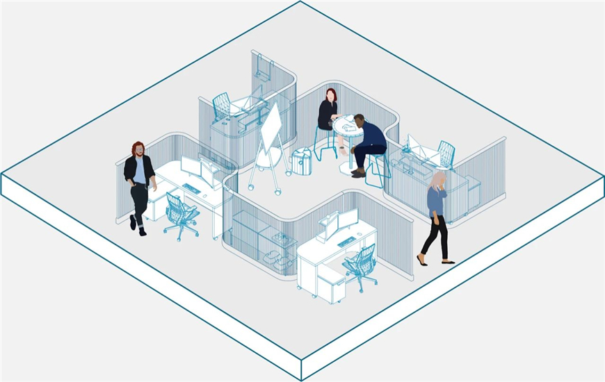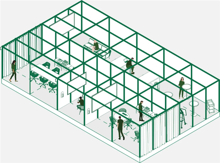 模塊化家具和滑動隔斷,能夠有效地劃分區域起到“物理隔離”的作用。而一旦疫情消失,亦可改變布局,滿足業務發展的需求。